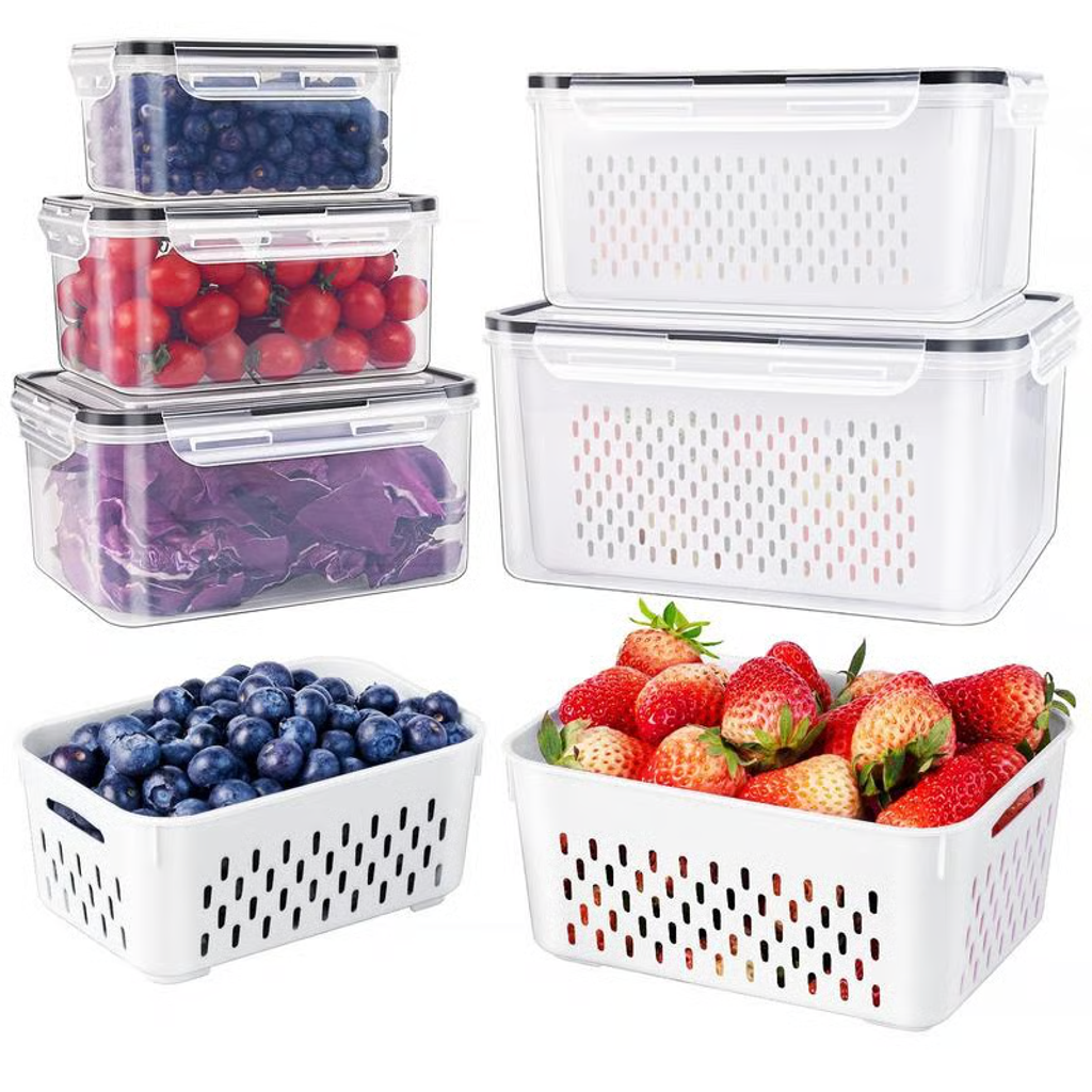 4 in 1 Multipurpose Containers - 4 in 1 produce savercontainers for refrigerator can combined soaking,washing, draining and storage functions, make yourvegetables and fruits to keep produce fresh longer.BPA-FREE Food Grade Material -Fruits storage Containermade of premium quality PP material which is BPA FreeDurable and recyclable.