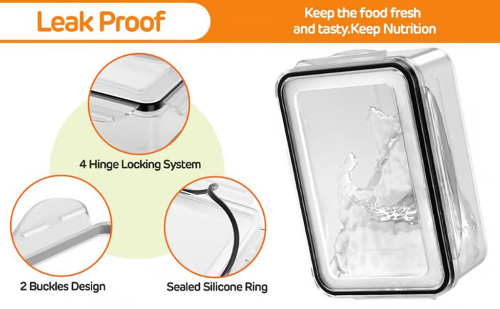 Airtight and Leakproof Food ContainersFridge organizers feature a food-grade silicone seal and4 reinforced locking clips that ensures superiorairtightness, keeping your food fresh, dry, and nutritiousfor longer periods of time, preventing spills and leakageof food smel.
